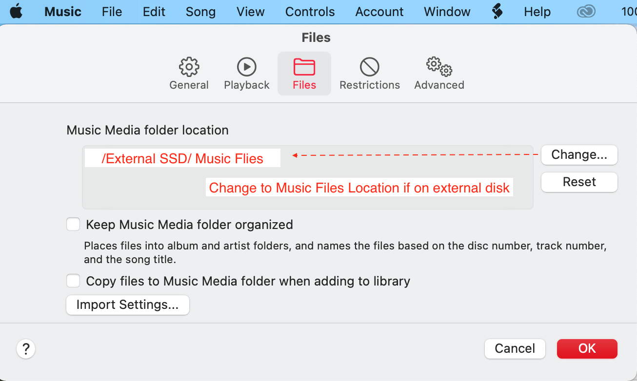 If you wish to keep the music on the external drive it will work as long as the path has not changed - if not (path change?) you may need to manually point the Music App to the location of the files on the external drive see screen shot of music preferences below.