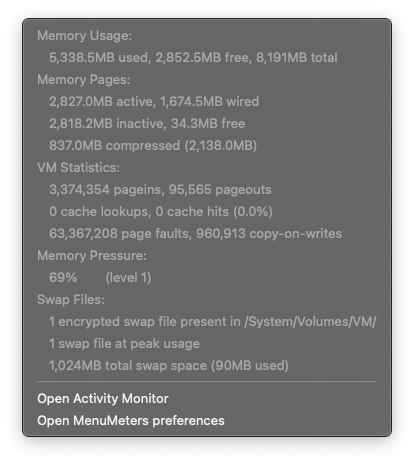 I'm really surprised there isn't more love for MenuMeters here. I've used it for ages and it lets you show RAM, Network, Disk, and CPU usage nice and compact in the menu bar, and even includes any temp you'd like to monitor in real time. I've never had any stability issues with it, and it's always been a fantastic experience - I've been using it since around 2006 or so under Tiger.