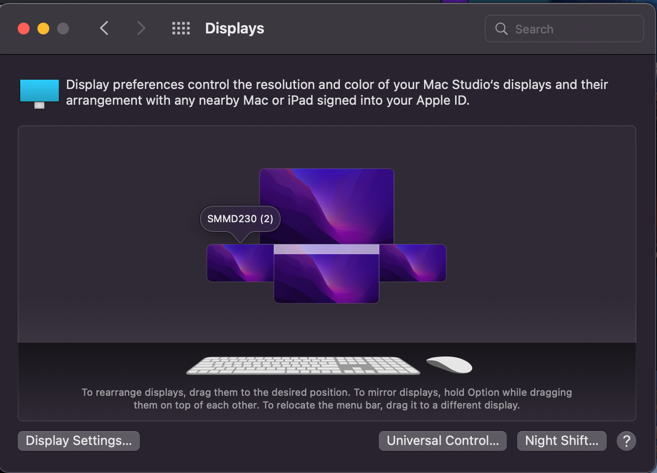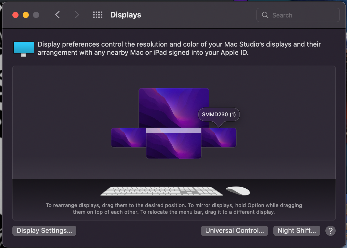 As you can see in the photos, just my left and right SMMD230's swap places. I've tried messing with displayplacer code, but it seems to get messed up after a couple weeks and the monitors eventually change names (see how they're labeled 1 and 2 now instead of the original and (1).)