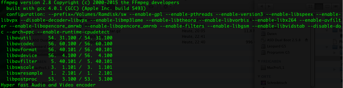 Im searching for a newer version of ffmpeg optimized for G5. 3.4.2 or newer would be nice. A compiling guide for ppc can also help.