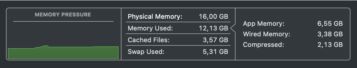 All this to say it's the computer itself that I have had doubts about and I want to find the best option for me. Storage wise I bought the 512GB option for the iMac to be safe with storage headroom and the speed benefits of a bigger SSD. Having said that I can conclude that I haven't been using all that storage at all. Right now about 130GB is being used on my iMac so I feel like 256GB should be sufficient for the new computer since I don't plan on installing any storage demanding programs in the near future. With regard to ram I have attached a picture showing the current situation in 'Activity' Monitor' about memory pressure. Some "swap used" but not a lot and I never see the pressure graph turn into yellow/red so I imagine 16GB for the new system will be just fine?