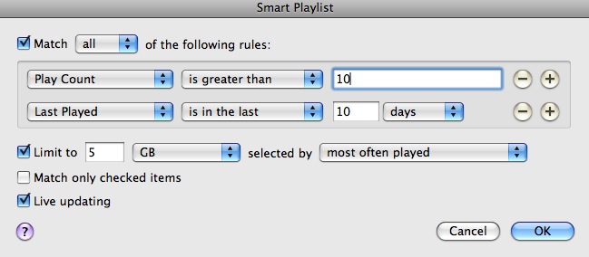 i'm due to be getting an 8gb iphone from a friend soon, and seeing as how my full library is too large (72gb) would it be possible to make a smart playlist in itunes 9 that would just have my most played albums, and so it would max out at maybe4/5gb? i'm not the greatest when it comes to smart playlists so hopefully you guys can help me out