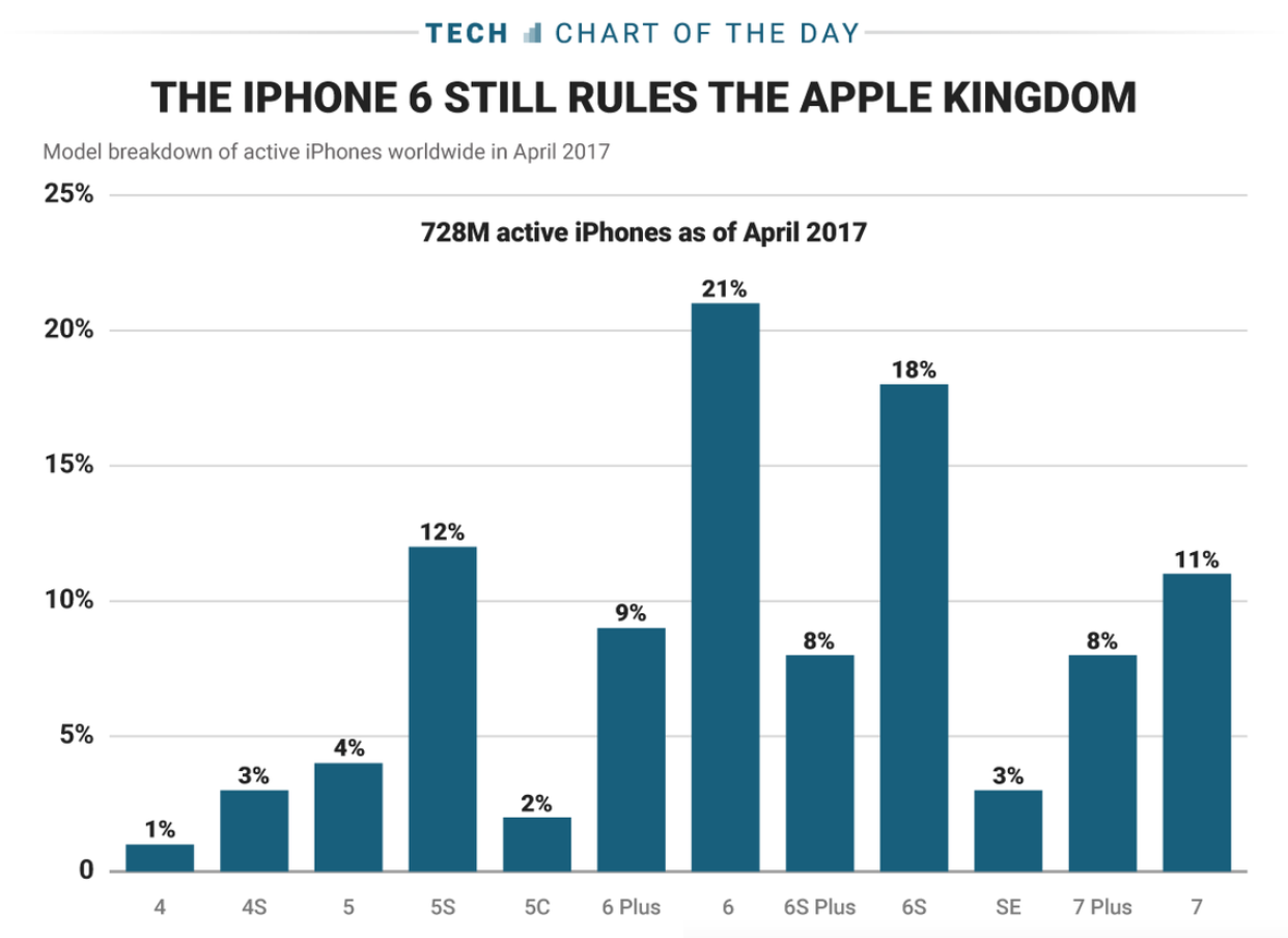 The iPhone 6 still works pretty well. If not for carriers offering the iPhone 7 for free after iP6 trade in, I'd still be using one.According to this Report iPhone 6 is on the top as of April 2017