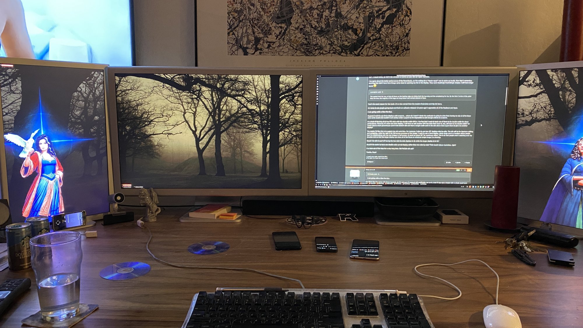 The reason I'd like this is to support my old work-flow. For instance; I plan to use two 30" displays side-by-side. The left will be for Aperture editing and navigating, while the right is for full-screen previews of the image. I want to use a third display, rather large and in a location where people that I'm collaborating with can see images in full-screen. It could be about 50" for maximum effect. This is so that people aren't watching over my shoulder and so that the larger display can draw all of the focus on whatever single image I'm showing.