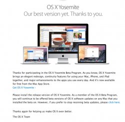 "Thanks for participating in the OS X Yosemite Beta Program. As you know, OS X Yosemite brings an elegant redesign, continuity features for using your Mac, iPhone, and iPad together, and major enhancements to the apps you use every day. And its now available for free from the Mac App Store.