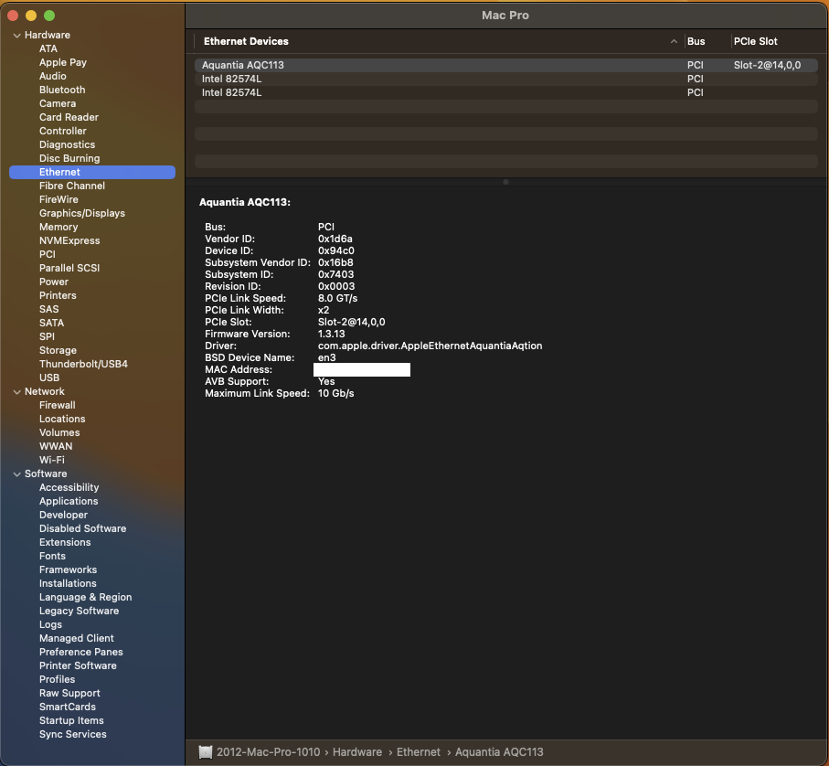 Under System Report -> Ethernet the card is recognized by the system but in my System Preferences -> Network I have a connection however it's yellow with PCI Ethernet Slot 3 has a self-assigned IP address and will not be able to connect to the Internet. I tried injecting the code above into the config.plist and copied the Kext files into my OC -> Kexts folder, I get recognition of the device in System Report -> Ethernet, this time the driver is com.apple.driver.AppleEthernetAbuantiaAqtion, but I still have the yellow and same connection status with the above condition - self assigned IP address.