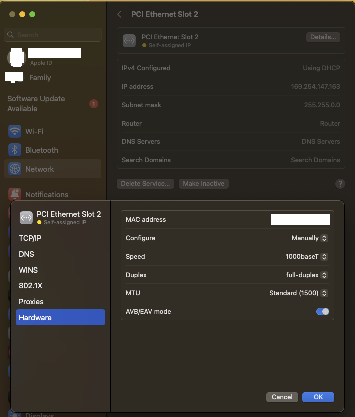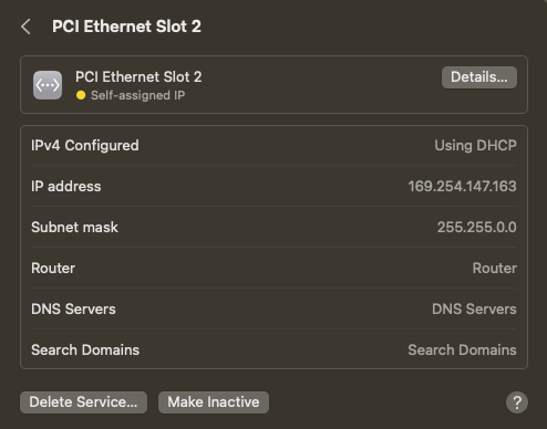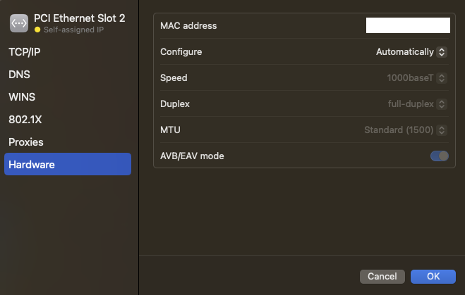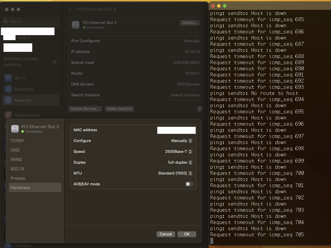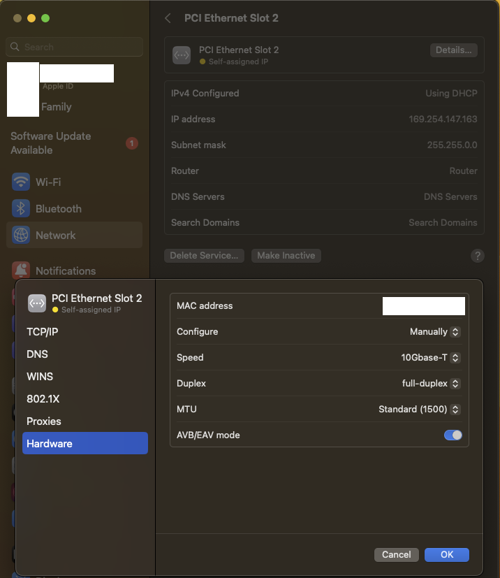 2--> With DHCP set and manually setting the link speed on the Mac Pro side only (leaving automatic link speed on the switch port side) no link speed, be it 1000baseT, 2.500Base-T, 5000Base-T or 10Gbase-T, gives me an IP address from DHCP resulting in a self assigned 169.x.x.x address.