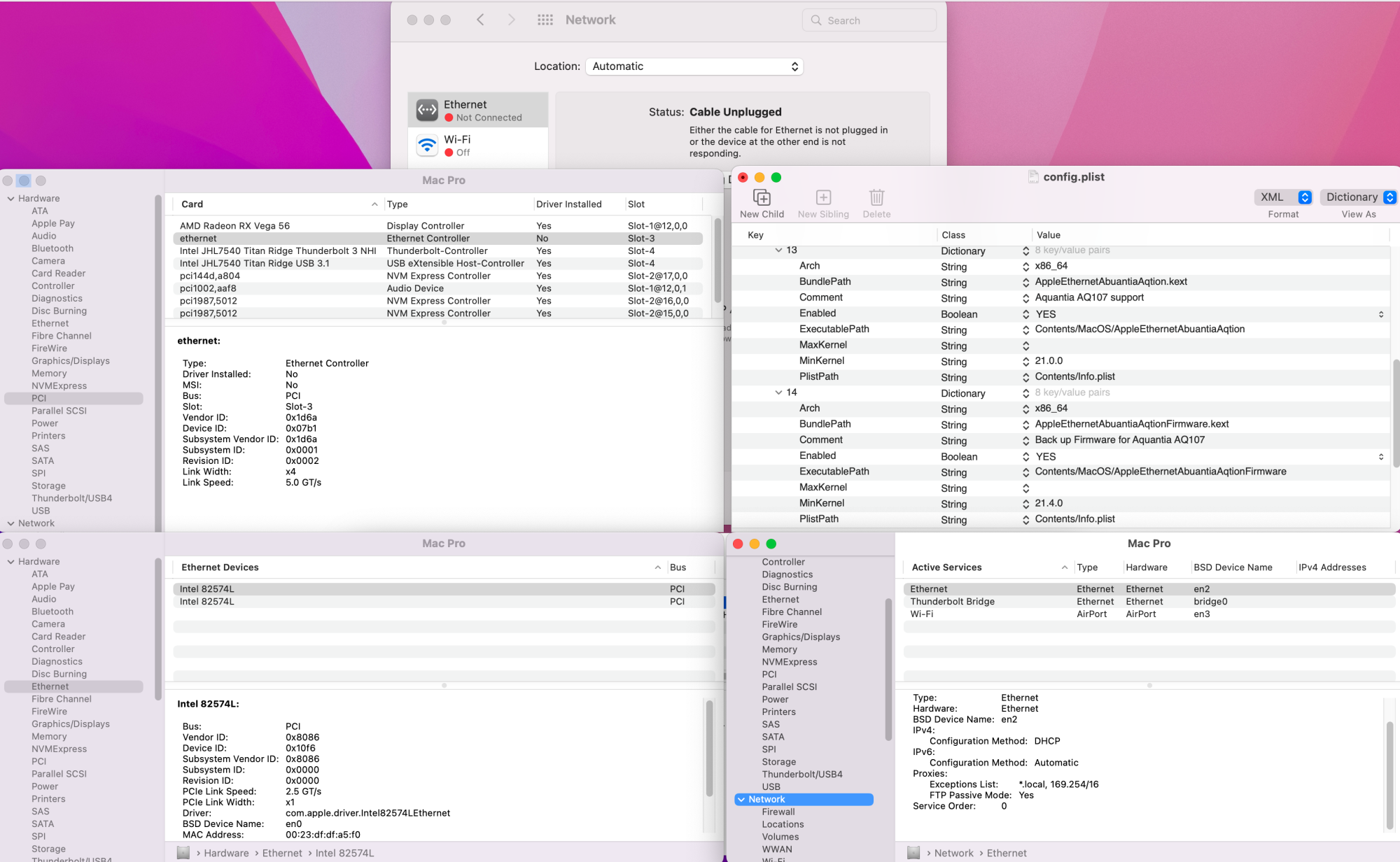 I'm fully aware of that MartinLo:s package is designed for max Monterey 12.7.x and that's why I use OCLP 1.3.0 for Ventura and Sonoma. Maybe I could have been a little clearer with that in my post. The point with my post was to inform that using the AppleEthernetAbuantiaAqtion.kext provided in MartinLo:s package didn't solve the problem with self assigned ip for my AQC107-B0 Nic but the two patches from CaseySJ, provided in the attached config.plist in my earlier post did. As other people in this thread seems to have the same problem I thought it could be a good idea to share this information. Is that a problem for you? Lastly I can guarantee you that my card is correctly configured and installed.