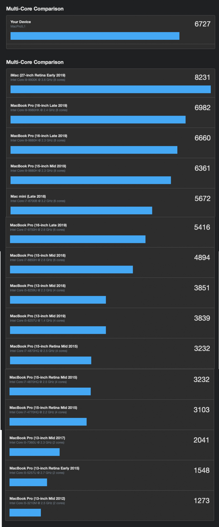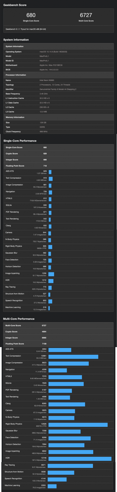I'm running the latest version of GeekBench with Mojave 10.14.2 (both pre and post upgrade) so my last-luster performance improvement is both disappointing and not making a whole lot of sense. I realize synthetic benchmarks aren't the best representation of real-world performance so I'm doing some other CPU-intensive tasks to see if I can "feel" a marked improvement.
