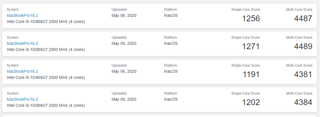 MacBook Pro (13-inch 2020, 4 TB, i5) - SC 1250 / MC 4450 (up ~30% SC / ~15% MC)