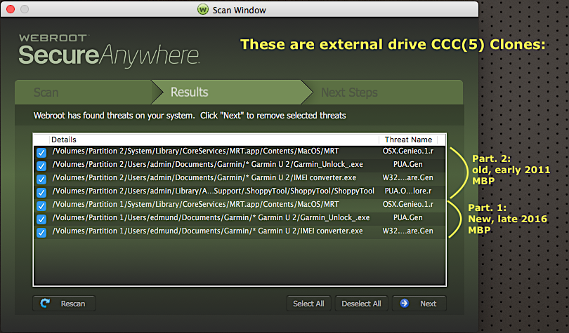 So I wanted to check things out. Malwarebytes found a couple of minimal things and resolved, but as I read on about Malwarebytes it's not antivirus, so antivirus should be used to thoroughly check along with. In comes Webroot. With Webroot, I also checked the external drive which is partitioned as 1 & 2 and contains CCC 5 clone of each MBP. Running Webroot to check attached drive, found the following. This MRT App concerns me.