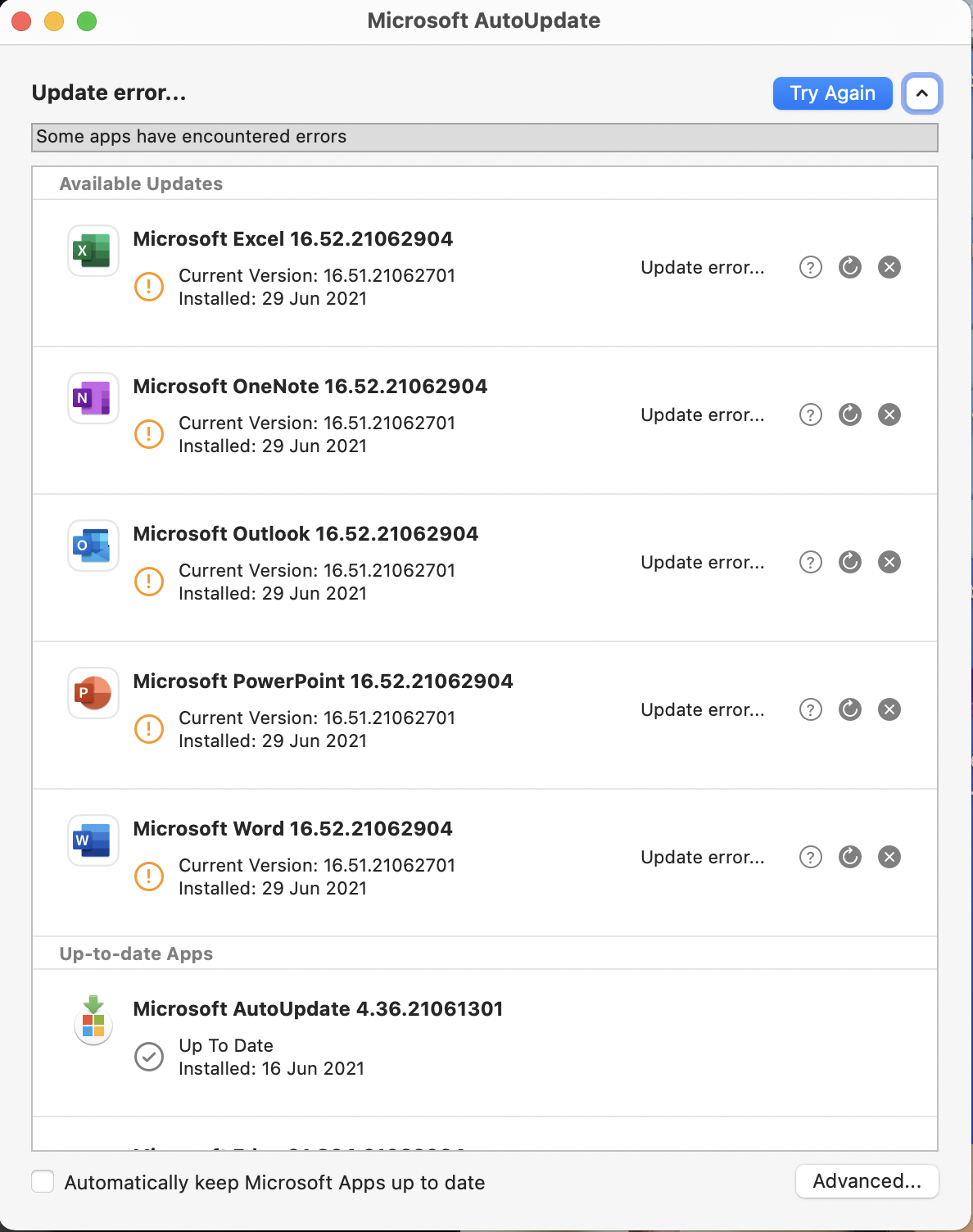 I have always found the MS updater to be a) fragile, b) network verbose and c) likely intrusive. Some time ago (2? years) I uninstalled the 'downloaded from MS' Office and installed from the Apple App Store. Now, no MS updaters and reliable updates via App Store.After I installed 12.0 I can not update my office apps anymore using the updater that came with the office install. Anyone else having this issue? They just return update error.