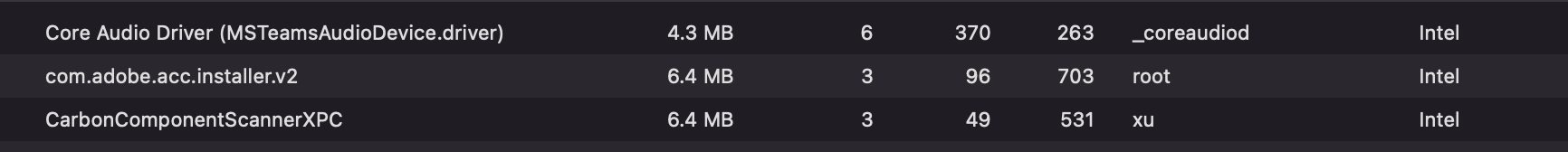 You can use Activity Monitor to get information about the process. I don't have the CoreAudioDriver process when I run the x86-64 version of Teams but when I click on "CarbonComponentScannerXPC" and Open Files and Ports tab, I can see that it is a Rosetta process.Honest question for anyone who wants to answer: How does macOS on an M1 machine deal with a driver situation like this? Does Rosetta 2 handle it somehow?