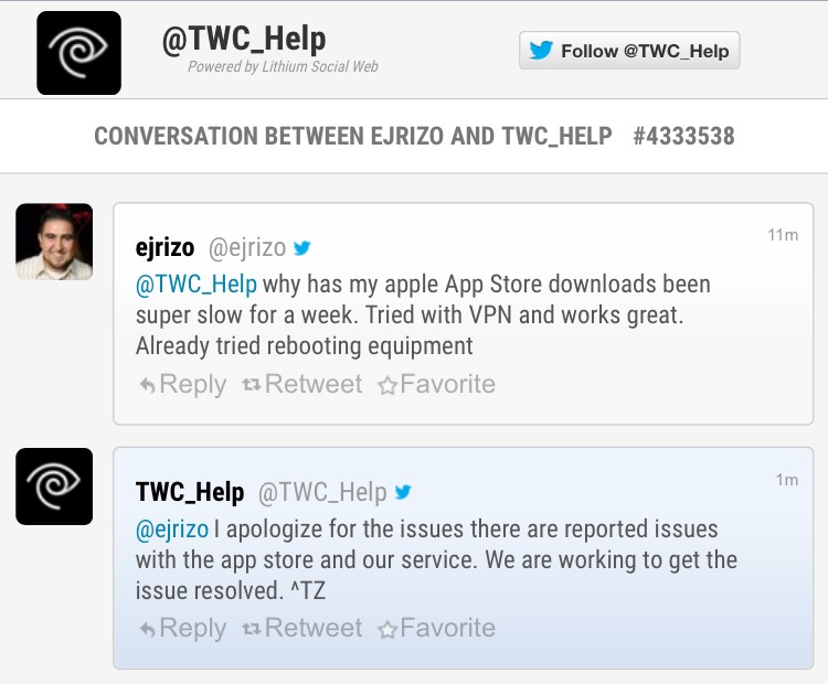 Just got off the phone with TWC. Issue has been affecting them since Thursday PM. There is an issue between Apple's server and their own server. Apparently Apple issued an update to their server on Thursday that caused a disconnect between Apple and TWC. There is no ETA on the fix. This is good and bad news. Good, because now I know whats wrong, bad because its already been almost a week and they still don't have an ETA in sight. They are working directly with Apple. Joy.