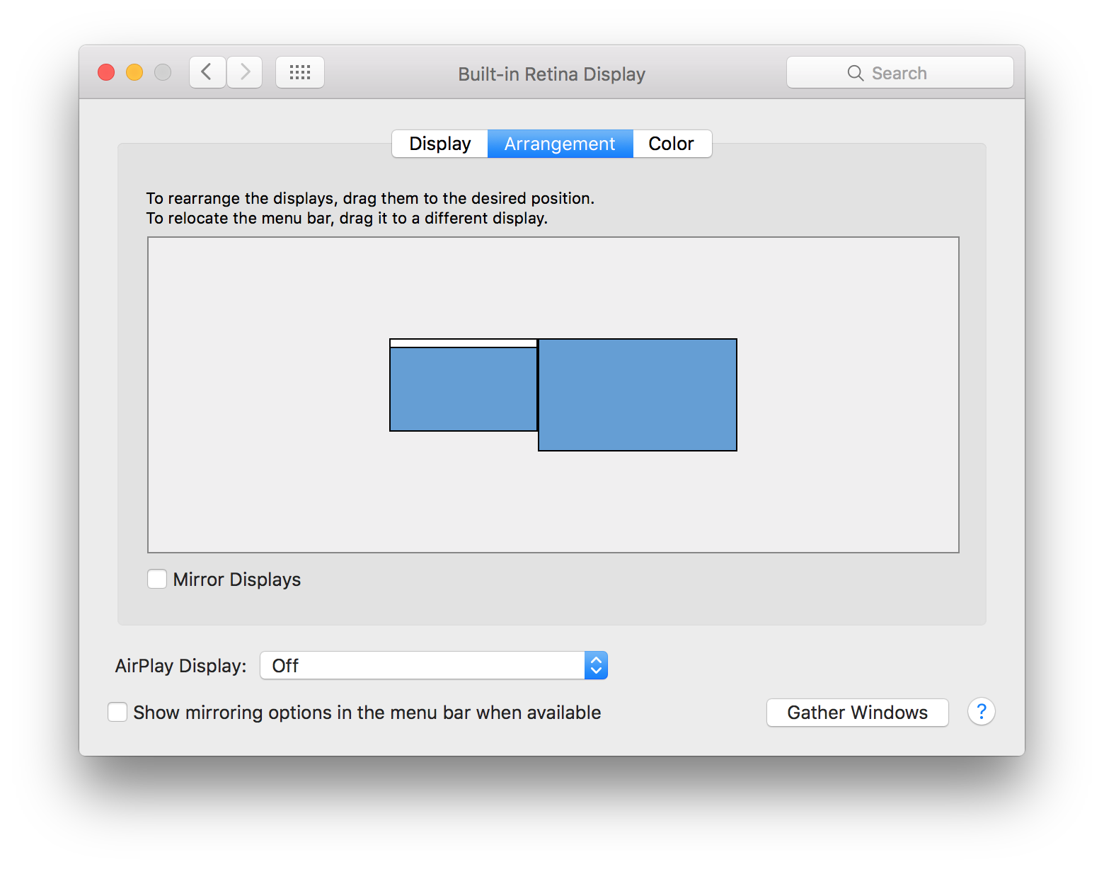 Now, use your favorite image editor that supports layers to make some boxes of the right pixel sizes to represent your laptop screen, the external monitor, and the bezels. Arrange these boxes on top of a large image for the wallpaper and save out the two images you will need for the wallpaper: one image for each display. This will allow the images to line up on both monitors. In your case, you will need a starting image of 2880 + 226 + 4736 = 7842 pixels wide and 2664 pixels tall.