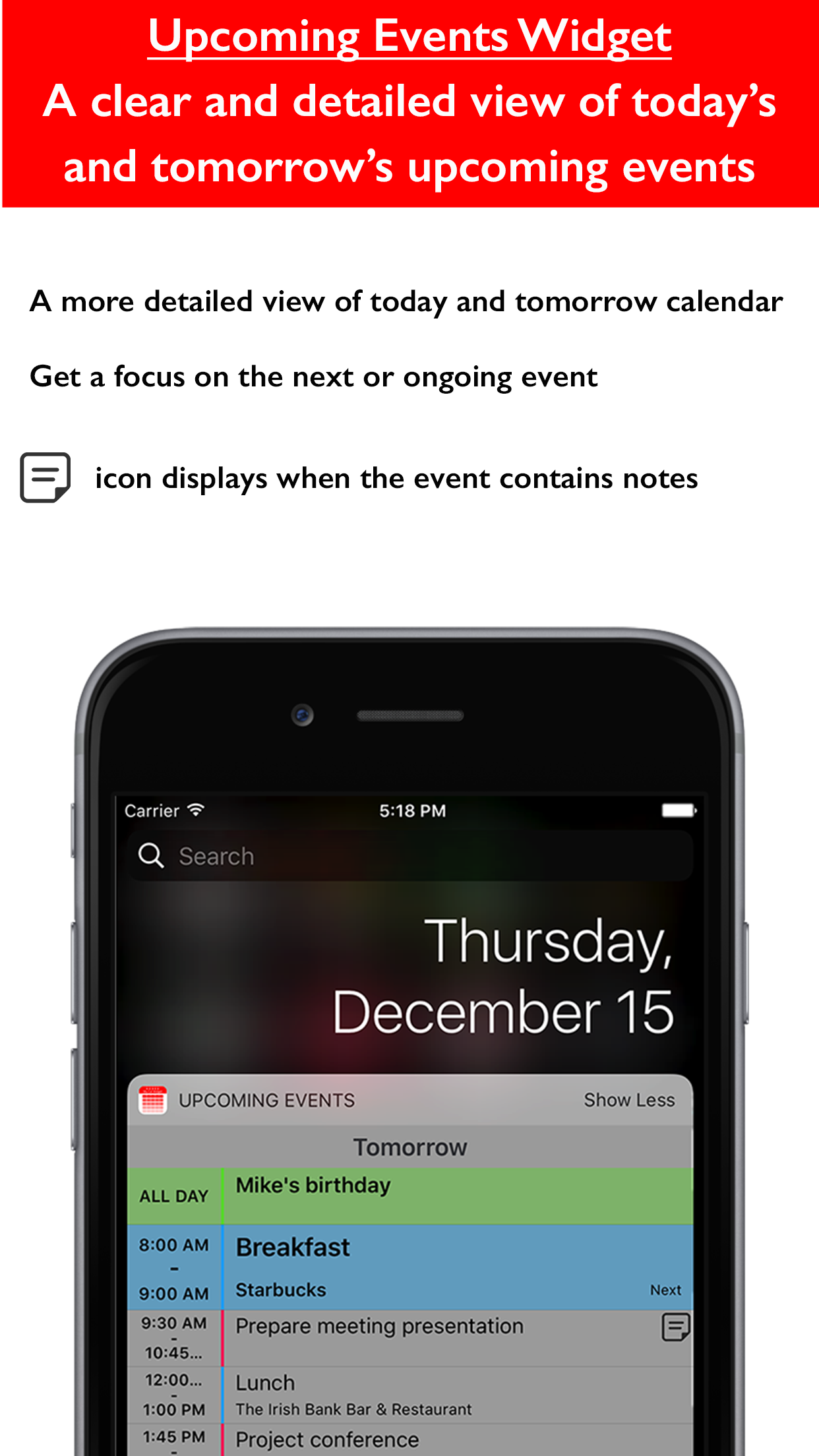 The app contains two different widgets: one that displays only upcoming events for the current and next day, and another one which is a month calendar.