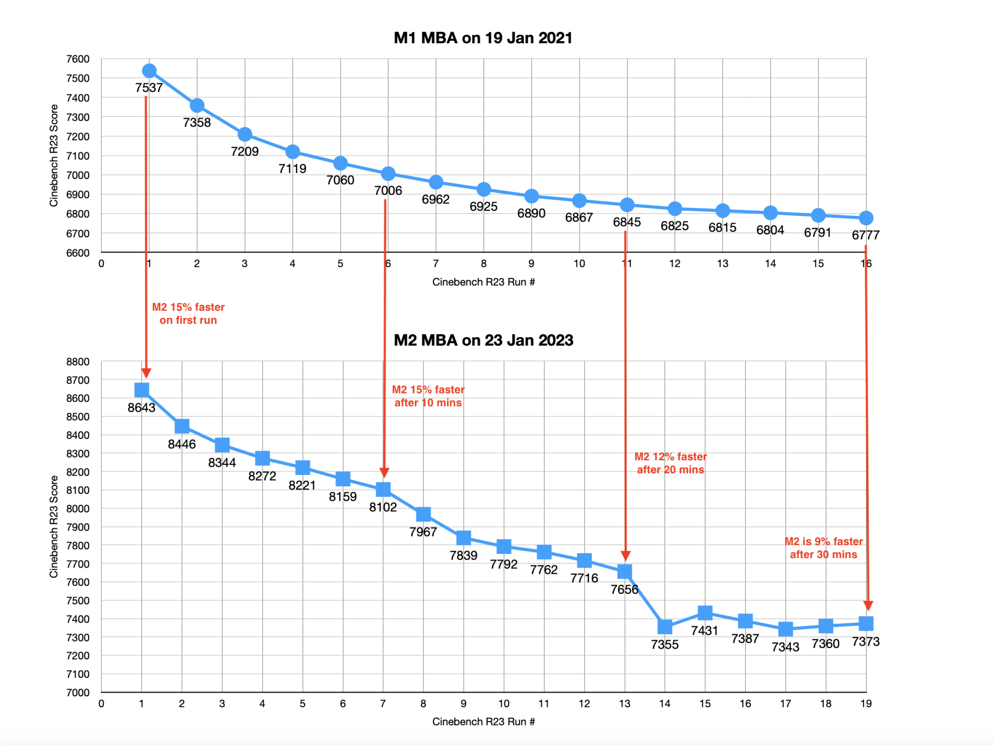 Running continuous Cinebench test for 30 mins is a common way of assessing CPU throttling, which is a hot topic on the fanless M1 and M2 MBAs. I have seen claims that the M2 throttles more. I tested my M1 MBA (512/16) in Jan 2021, and just upgraded to a M2 MBA(2TB/24), and reran the tests out of curiosity. This chart shows the results: