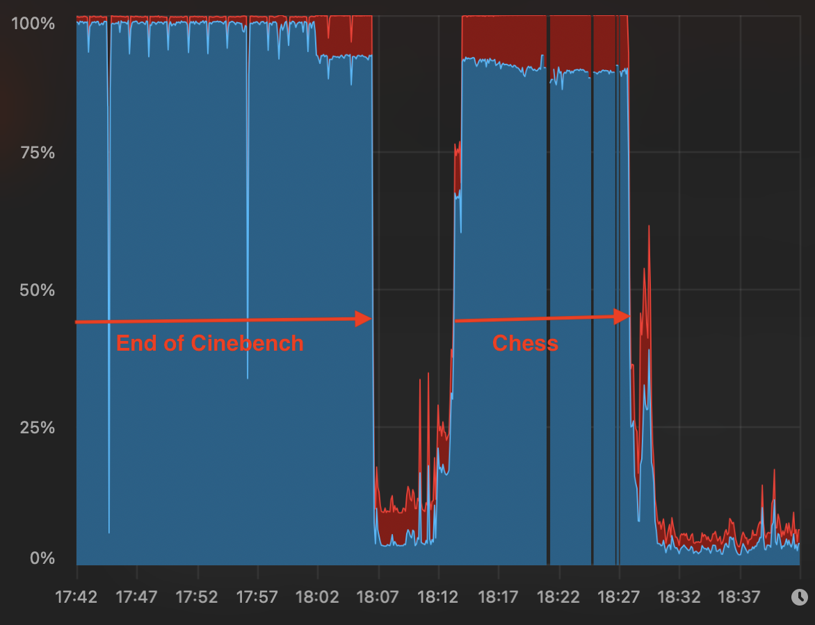 The CPU % and CPU Core Average temp plots from iStat are below. Red is System, blue is User. So it looked like the User CPU dropped for last two runs, corresponding to the extra drop in Cinebench score. The Chess phase looked like it never had 100% user. And note that the sharp drop in CPU temp occurred at 18:17, but there is no corresponding change in the CPU used.