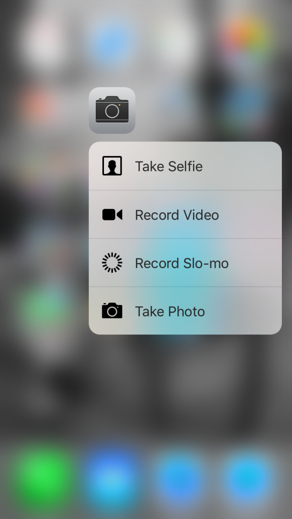 Let’s take the camera app for example, I press hard on the Camera icon and it pulls up a list of options that I can initiate such as Take a Selfie, Record Video, etc.
