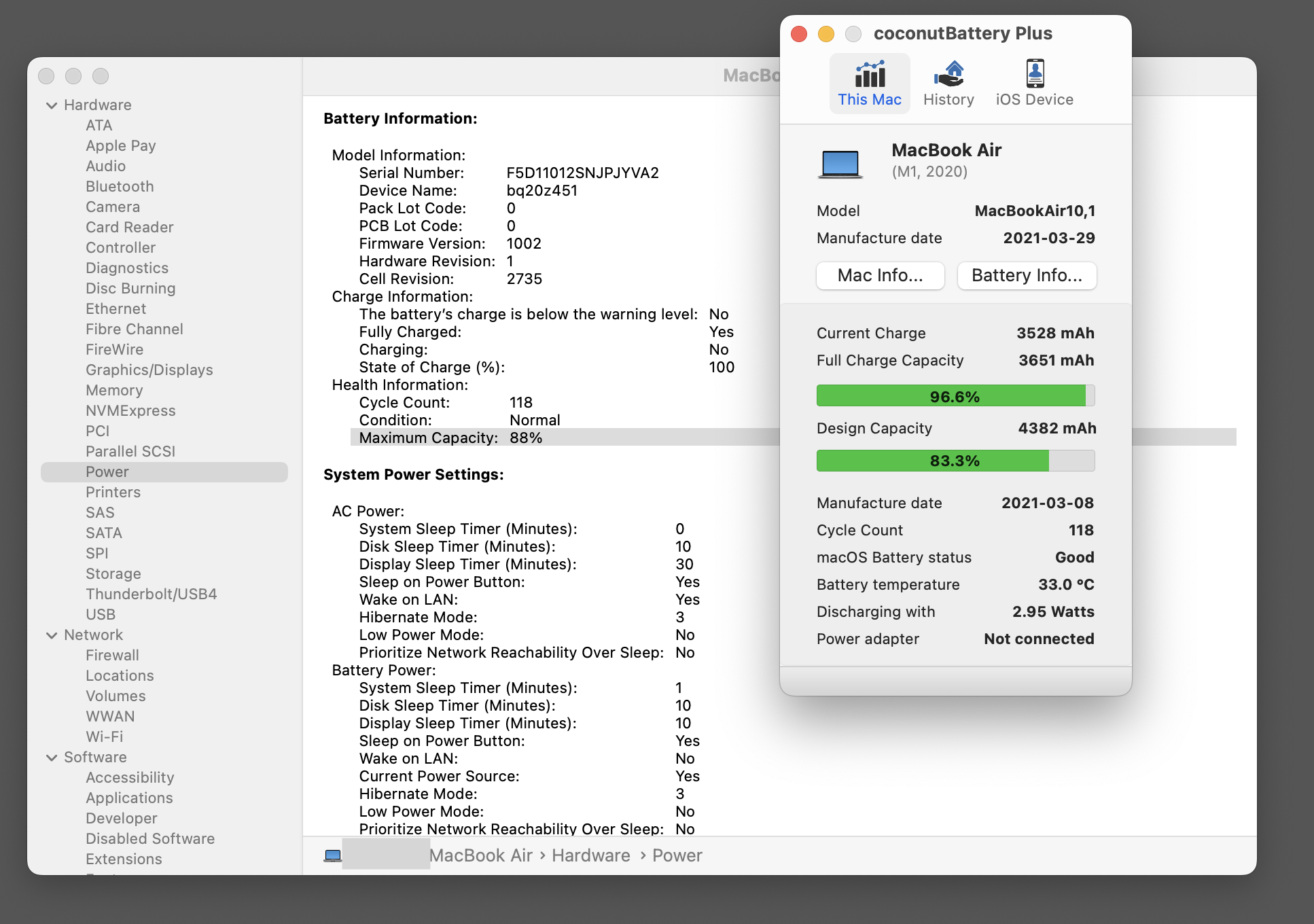 As for the state of charge discrepancy… Something of a two-part question… Does the SOT vary when the percentage(s) are below 80%? At the time of the screenshot, has your MBA (i.e., macOS) been reporting 100%/fully charged for a while?
