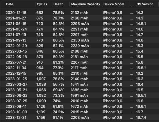Whether this is CoconutBattery being inaccurate or Apple's metrics being "optimistic" I don't know -- but it makes me think it's best to take these health estimates with a grain of salt.