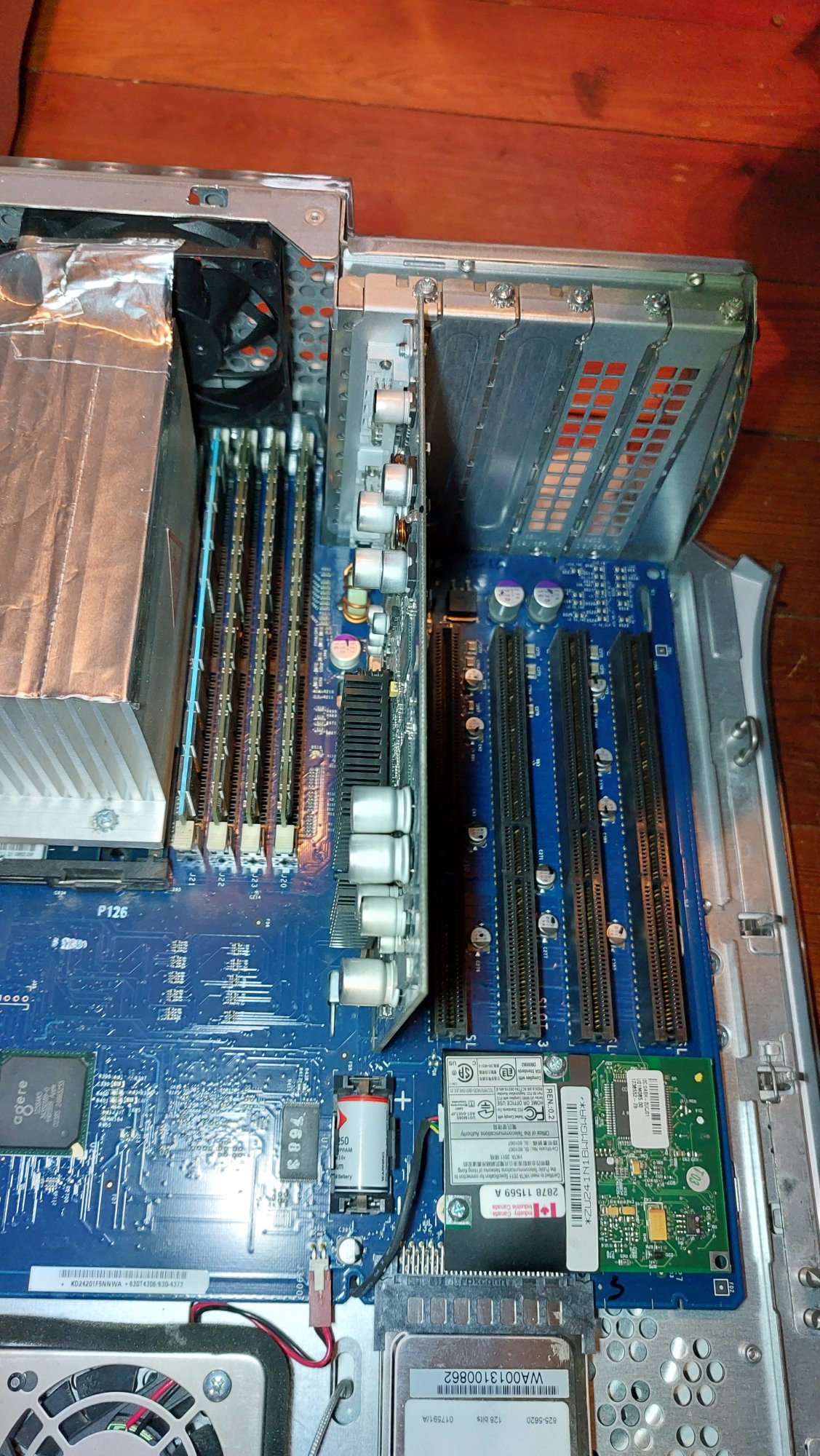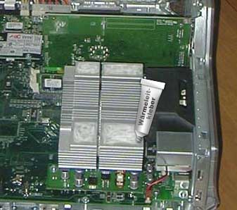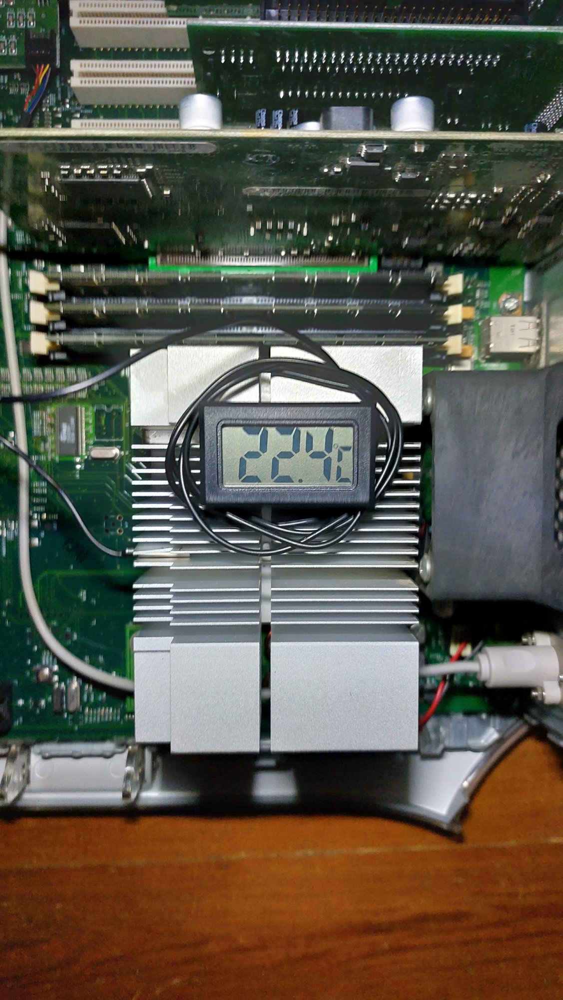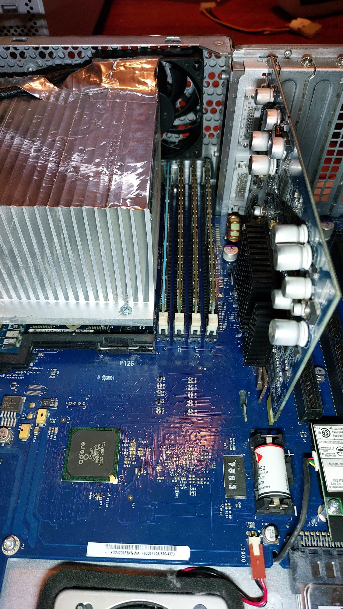 The first thing i did when i got my MDD was attempt to improve the cooling as i do not have air conditioning in the summer. I took aluminum tape and put it over the top of the heatsink to force the air to stay within the airflow channels instead of blowing in and out the top of the heatsink and causing turbulence and air buffeting noises. I was very careful to keep the edges of the tape completely even or just back from the edge of the heatsink so i didnt block any of the airflow. I also added a fan behind the heatsink pulling air through the top half of the heatsink that the main big fan doesnt really blow air through. That fan is half ducted to the heatsink with more aluminum tape and the other half is left open over the memory to pull cool air over the memory and video card. A 20x70x70mm fan fits perfectly. You could also use a 60mm as those are easier to find. A 25mm thick fan will fit but you will either need to modify the case or the heatsink in order to be able to slip it into position as there isnt quite enough room. I also replaced the top 2 pci slot covers with well ventilated ones for more airflow and i removed the speaker and double sided taped it to the top inside of the case to allow a little more airflow in through the speaker grille. I made no real attempt to make it quieter, this mdd is the original 2002 model with the original 400 watt power supply and fans. Its loud but not particularly obtrusive, it just sounds like theres a desk fan running somewhere in the room. With nap mode off it does keep the processor below 47 degrees in a 21 degree room without the main big fan speeding up so im happy with it. With nap mode on it eventually drops down to about 10 degrees above ambient temp. All temperature measurements done in celcius.