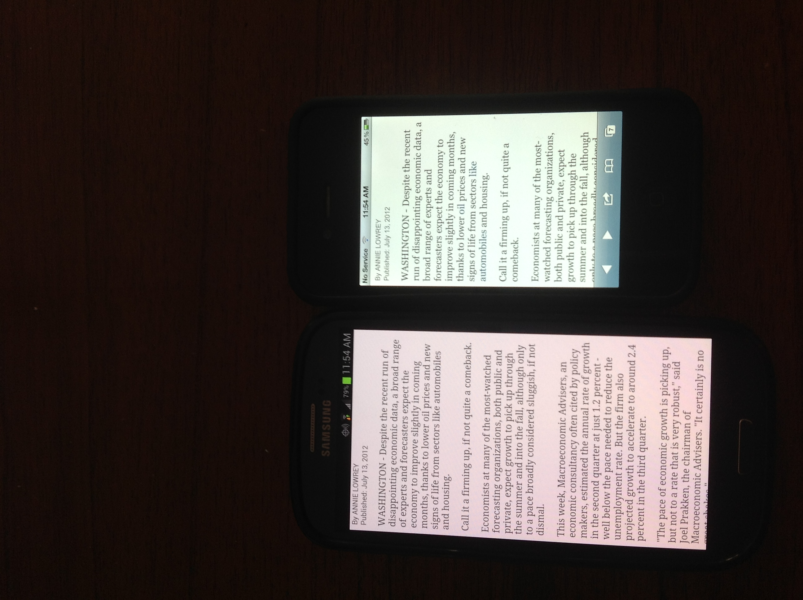 This picture pretty much sums up why I switched to the S3. Reading and web browsing is just a vastly superior experience on the 4.8" screen and LTE. There's no red tinge in person BTW.