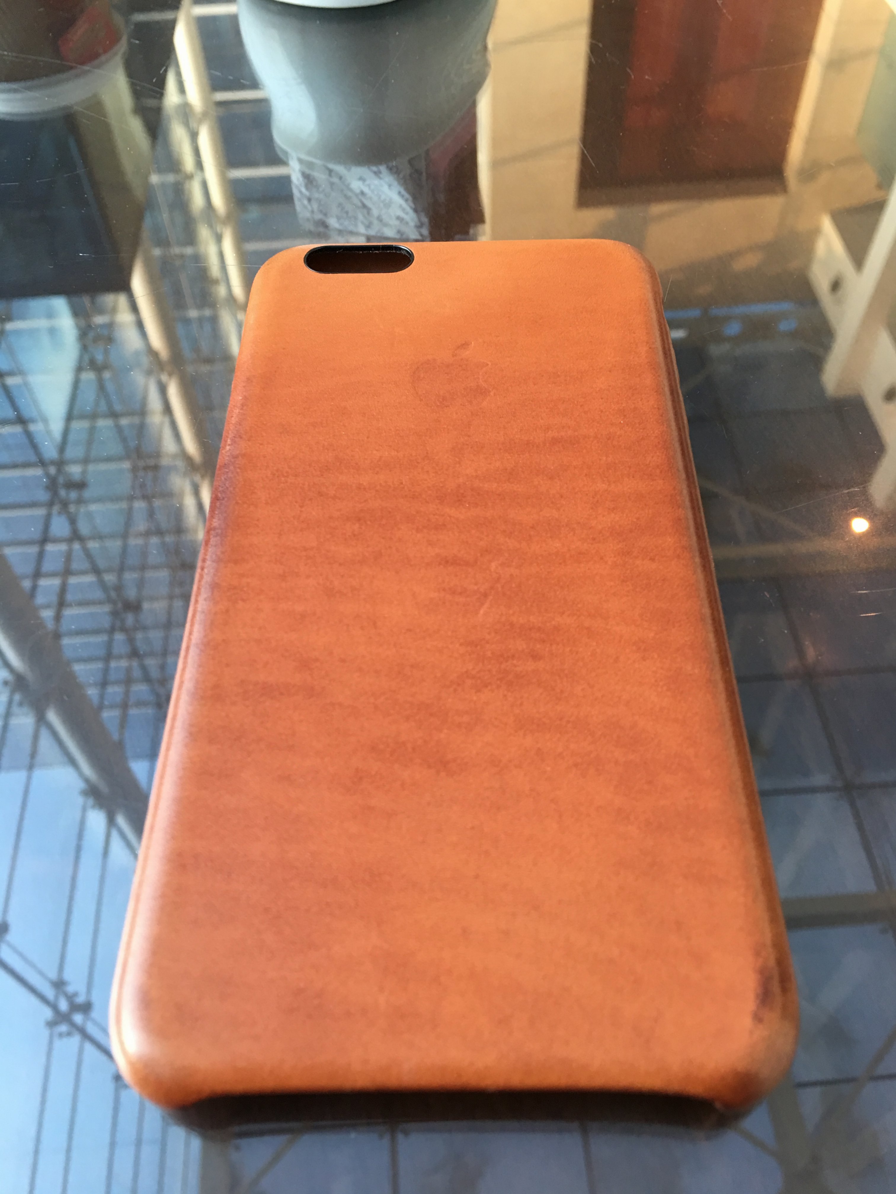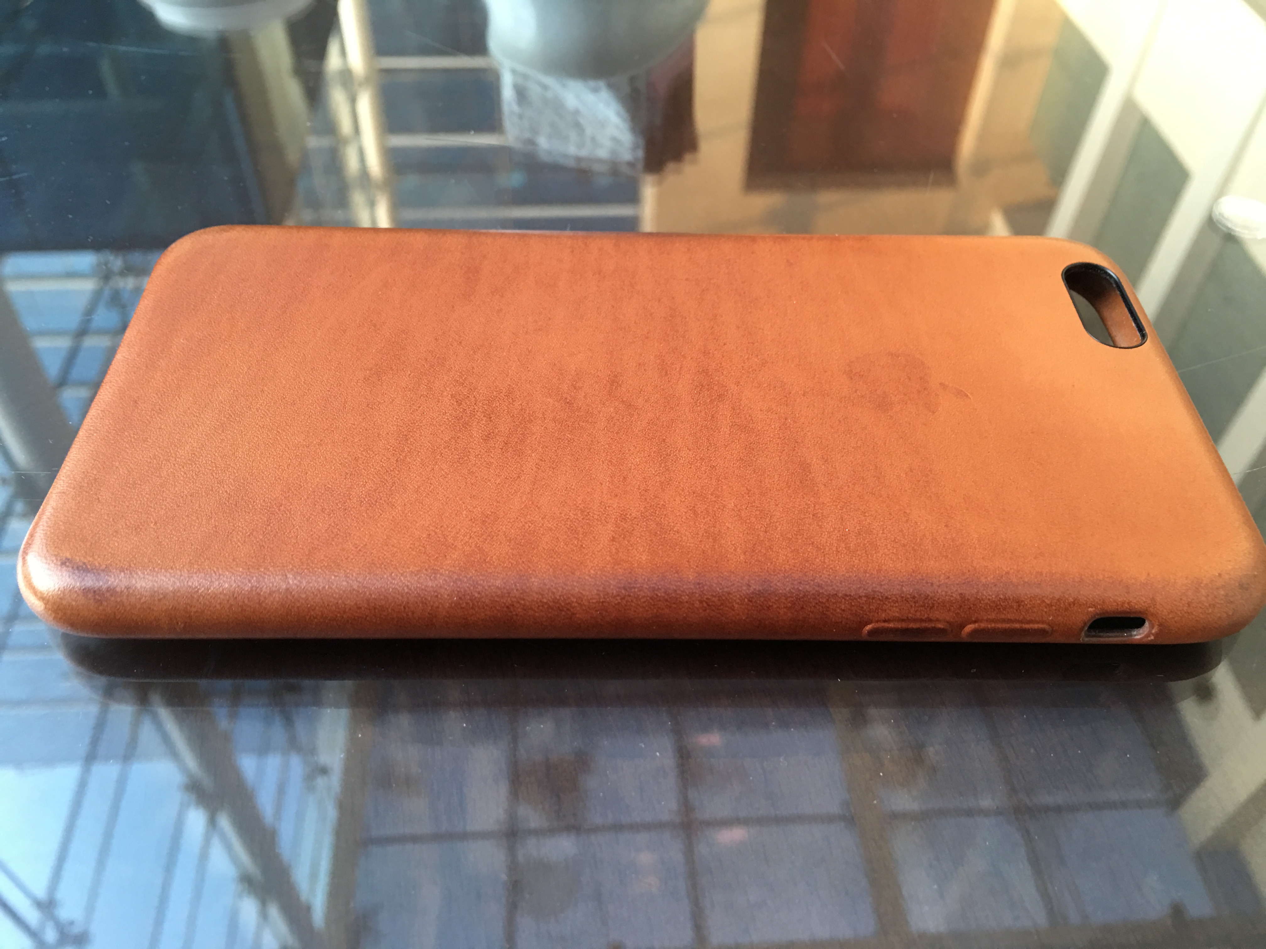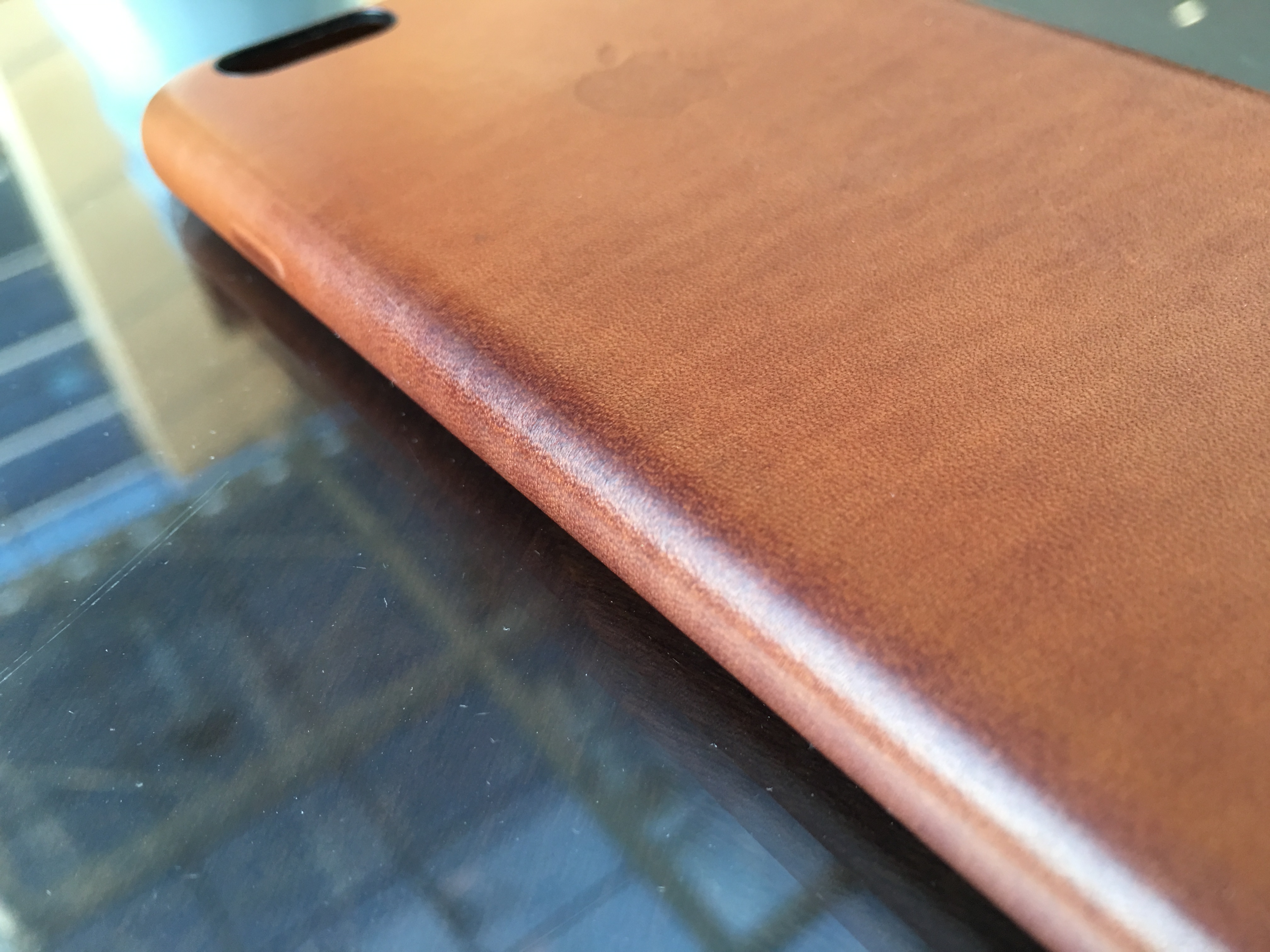 Here is my Saddle Brown Apple Leather case after approx two months of everyday use. I actually like the wearing look.