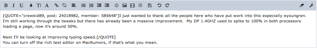 You can turn off the rich text editor on MacRumors, if that's what you mean.I just wanted to thank all the people here who have put work into this especially eyoungren. I'm still working through the tweaks but there has already been a massive improvement. My DP 1.4GHZ used to spike to 100% in both processors loading a page, now it's around 50%.