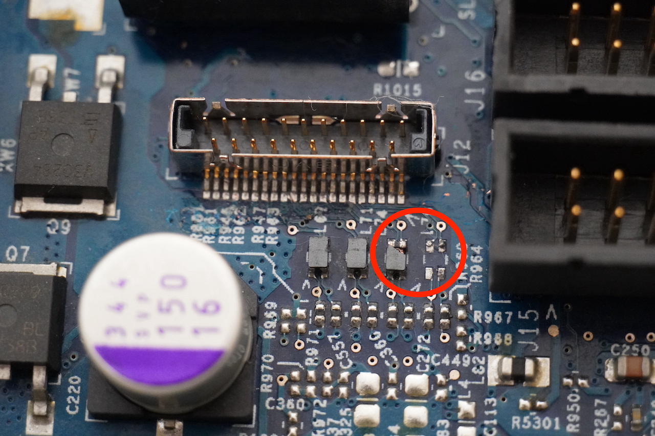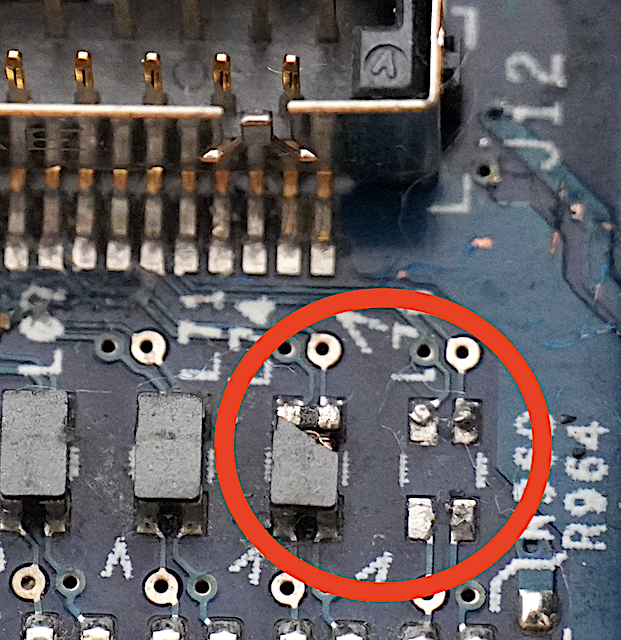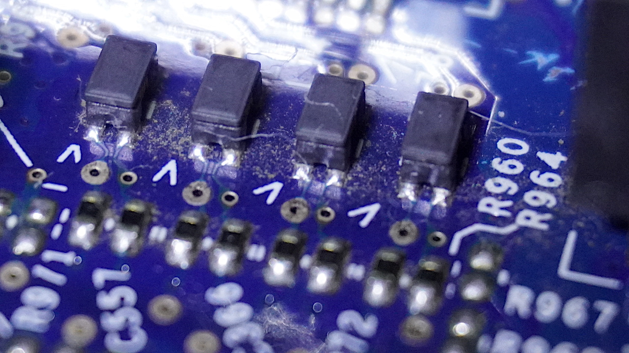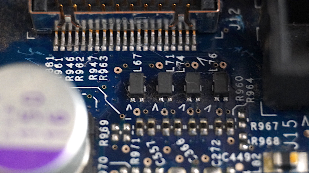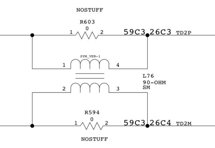 Another interesting finding is that those unpopulated zero-Ohm resistors (R603, R594, etc) have footprints on the bottom of the board directly underneath these common-mode chokes.