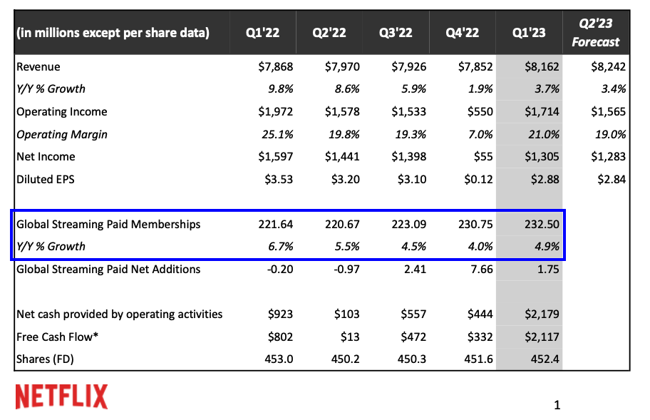 We’re on track to meet our full year 2023 financial objectives. For Q2’23, we forecast revenue of $8.2B, up 3% year over year, or 6% growth on an F/X neutral basis. We’re pleased with the most recent launches of paid sharing, and while we could have launched broadly in Q1, we found opportunities to improve the experience for members. We learn more with each rollout and we’ve incorporated the latest learnings, which we think will lead to even better results. To implement these changes, we shifted out the timing of the broad launch from late Q1 to Q2. While this means that some of the expected membership growth and revenue benefit will fall in Q3 rather than Q2, we believe this will result in a better outcome for both our members and our business (more details in the Monetization and Revenue section).
