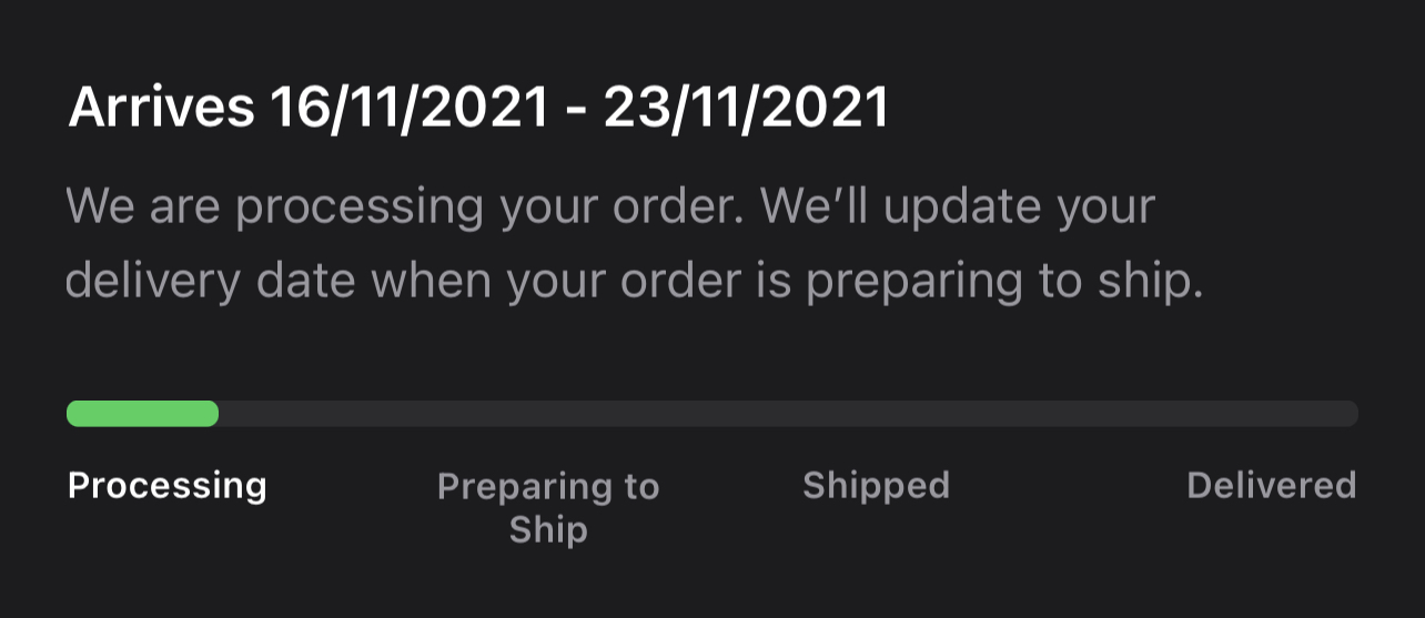 It must be the customization you chose that caused the prolonged shipping date. I also ordered immediately after the Apple Event. Mine will be received on Tuesday, 10/26. I ordered a 16” MBP with the M1 Max, 32GB RAM, 32 - Core GPU in Space Grey.Literally ordered mine 1 minute too late and ended up with a Nov 4 - 8 ship date. I’m excited but for that much money I do wish I was getting it on release day![]()