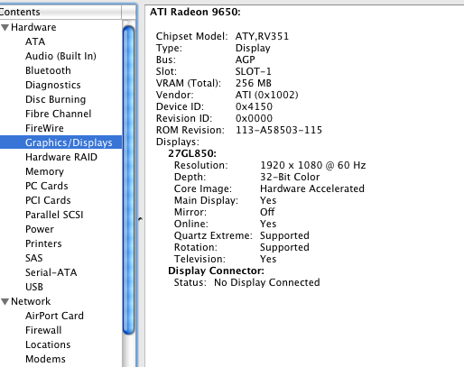 All good, except the graphics card, via DVI out (I don't have an ADC to DVI adapter) is giving odd artefacts in both OS9 and OSX. It's an ATI 9000 [edited - originally thought is was a 9600) from what I can gather, with 64MB VRAM. Trying to run it at 1900x1080, but have also tried lower resolutions. Tried res-eating the card, cleaning the pins etc. The caps look OK.