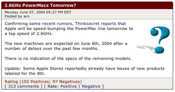 ThinkSecret did INDEED say on Monday that the G5s were coming out on Tuesday, they assured us of it, they were wrong, they've been wrong before, they'll be wrong again. Because ThinkSecret, like most rumor sites, plays revisionalist history to save their arse they've of course removed their original article. However, Macrumors, which is my one stop shop for all things Mac and Rumor, still has the post (attached)... I can read, can you?!? Oh, yeah, and notice the post date when it was put up, you seem like you'll have problems with numbers and math so I'll help ya out, it was posted on Monday and tomorrow, from Monday, is Tuesday, it's now Wednesday.