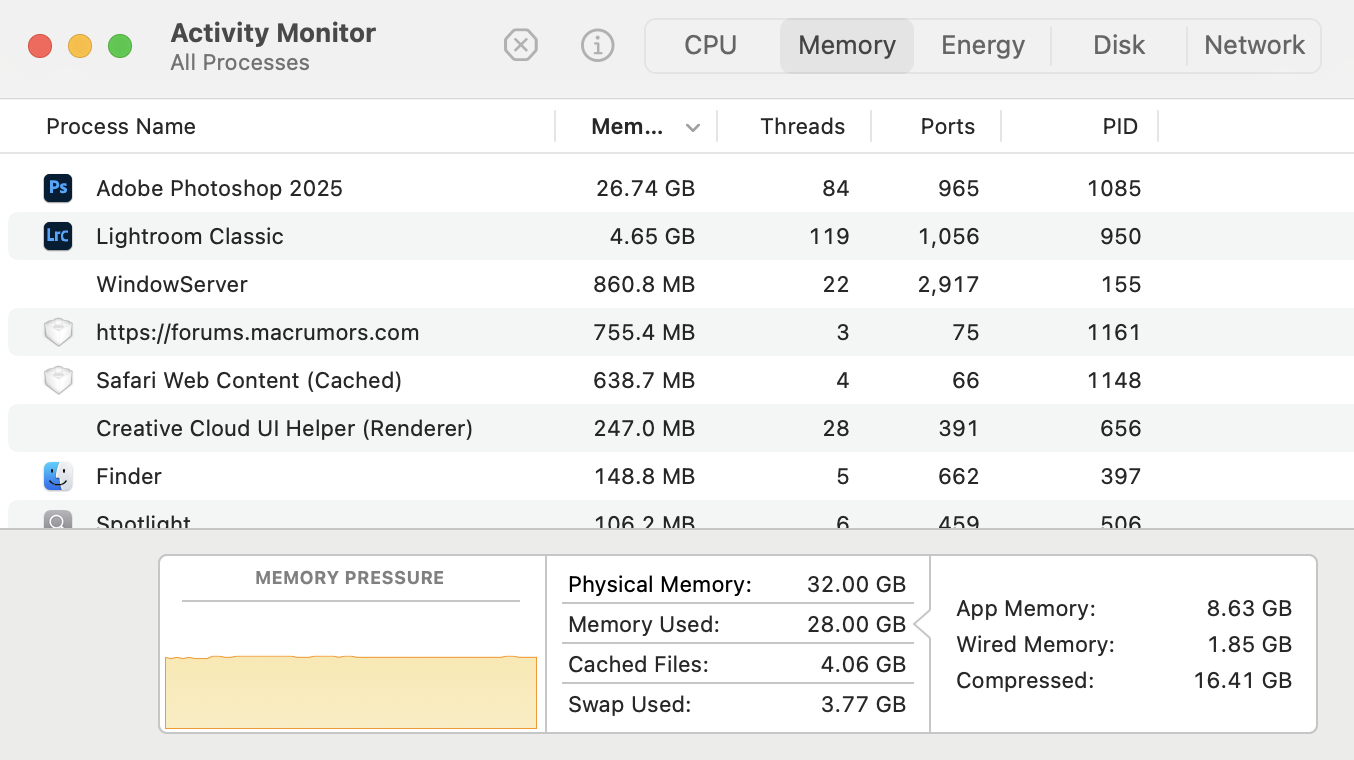 Heads up for users of Adobe apps - fairly easy to get to yellow memory pressure even with 32GB memory: