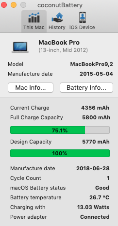 my original battery started to fail after 4 years of owning this 13" 2012 MBP. I bought it new at Best buy in 2015. With 10 cycles, the battery dropped to about 95% and after about a year, it was down to 86%.