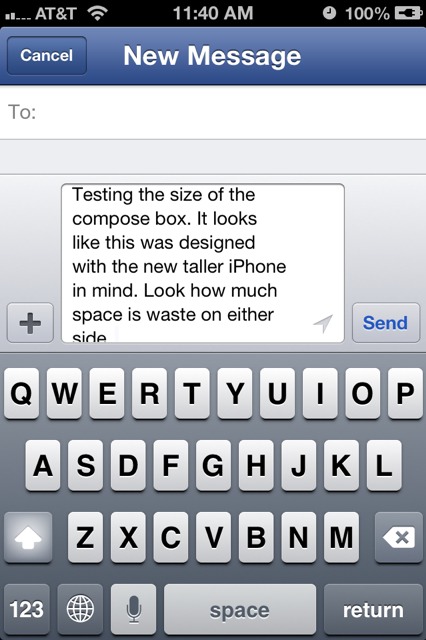Look at the size of the compose boxes. There's so much space waste on either side and after starting to write a few lines, it's really difficult to see anything else on the screen. Of course, this behavior will be just fine on the new iPhone which is slated to have a longer screen.