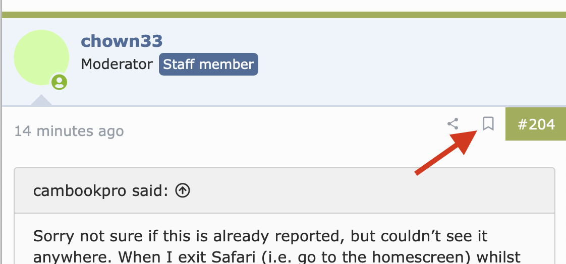 If there is a post or thread you want to save to come back to, you can do so. There's a bookmark icon on the top right. If you tap on it, you can save it to your own personal bookmark list that's accessible in your profile. You also tag them to find them easier later.