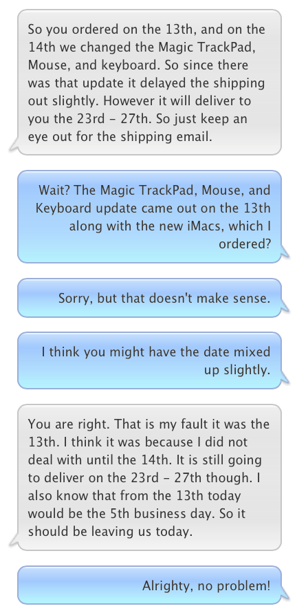 I ordered the maxed out 27 inch iMac with the i7 and m395x on the 13th, but it is still in Processing mode, not even Preparing. I tried Chat, but they were no help. Just said to check order status.