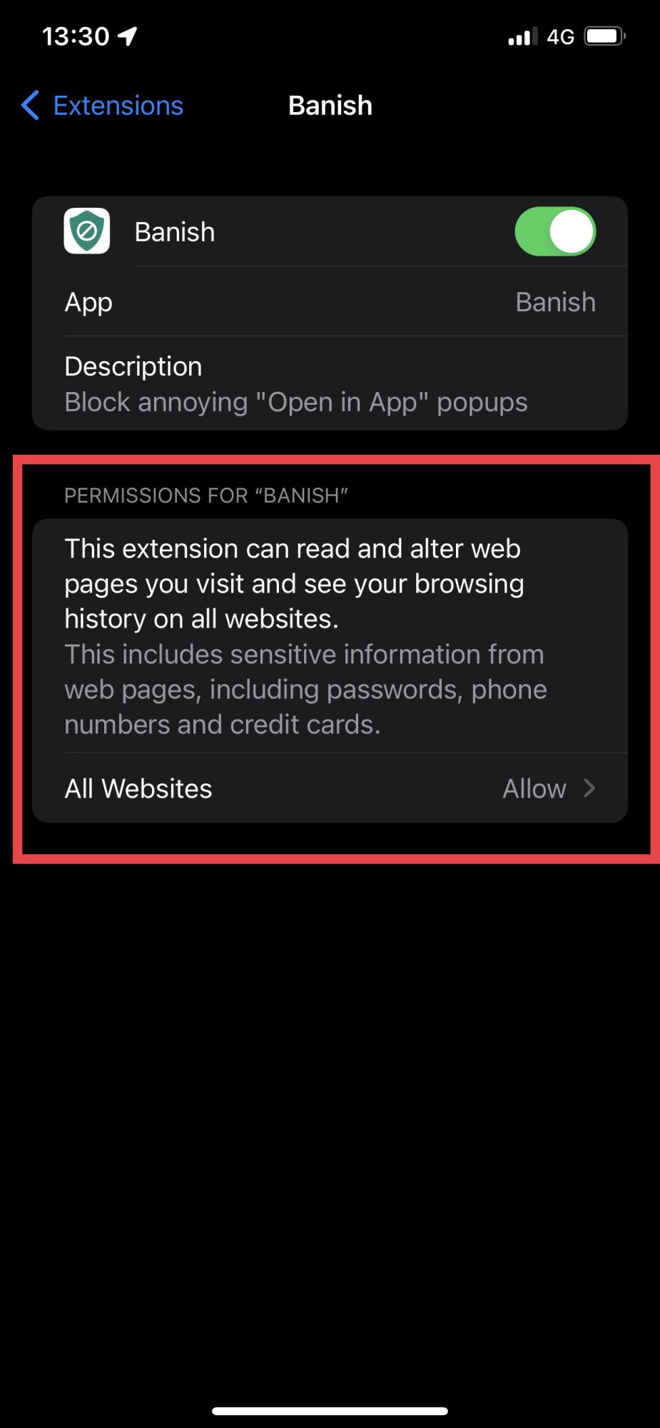 Also, it seems to be possible to activate Banish under ‘content blockers’ (which do not have this kind of access) without activating the actual extension, although I haven’t tried yet if this has any effect on functionality…