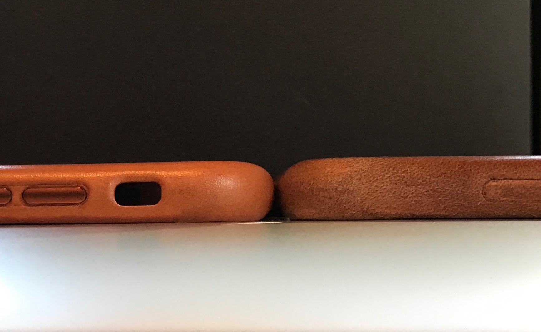 1. While the Nomad leather is thicker than the Apple leather, in terms of actual case thickness and with the phone in the case, the difference is minimal to the point that I can barely discern any tactile difference between the two. I say tactile because all of the edges are thinner and more tapered/rounded on the Apple case, which optically makes Apple case appear to be slimmer to greater degree. Using a straight edge to compare, the Nomad may be a couple tenths of a mm thicker if that, but it's a difference that feels smaller than that but looks greater than that. In terms of weight, again the Nomad looks more substantial and does in fact weigh more, but only 4.8 grams more (23.8 v 28.6 grams) which is not noticeable.