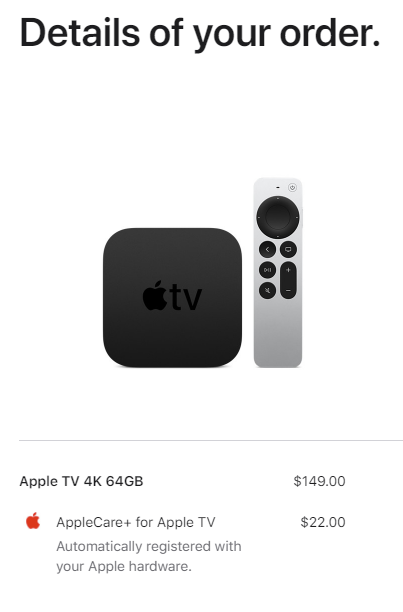 Genius!Funny how I had errors popping up when I tried to add the AppleTV without AppleCare and was being told “product no longer available”, but if I added AppleCare, it went through. Just removed AC from my cart and finished my order. Nice try, Apple! 😂