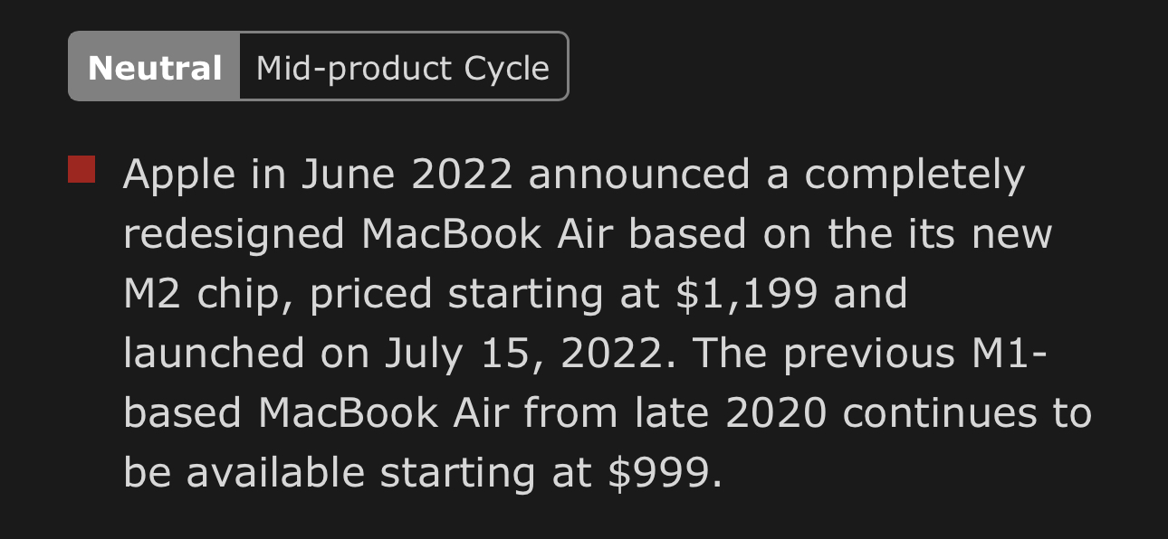 "The supply chain is more focused on the more affordable MacBook Air, which is expected to be updated in the second half of 2023 and may be equipped with a 3nm processor," the report says, citing industry sources. The report does not provide any additional details about the MacBook Air or a more specific launch timeframe.