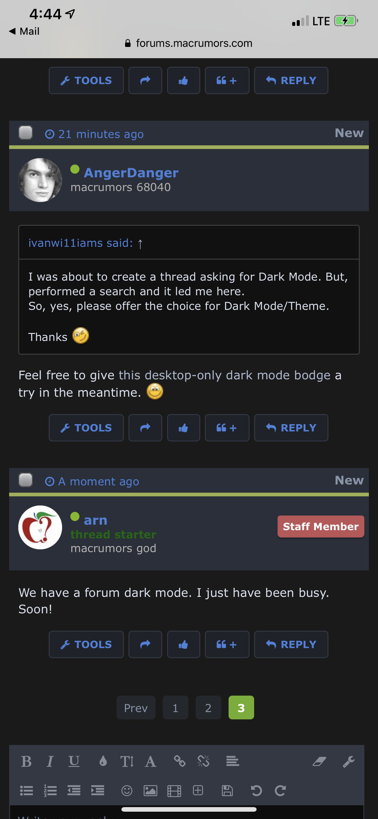 Well, the other big Mac site already has dark mode enabled. I won't mention it because I don't know if it is allowed or may be considered spam or something, but one of my two main Mac websites just released its Dark Mode. Now it is time for MacRumors. A dark grey would be nice, instead of a pure black, but that's just my personal preference.