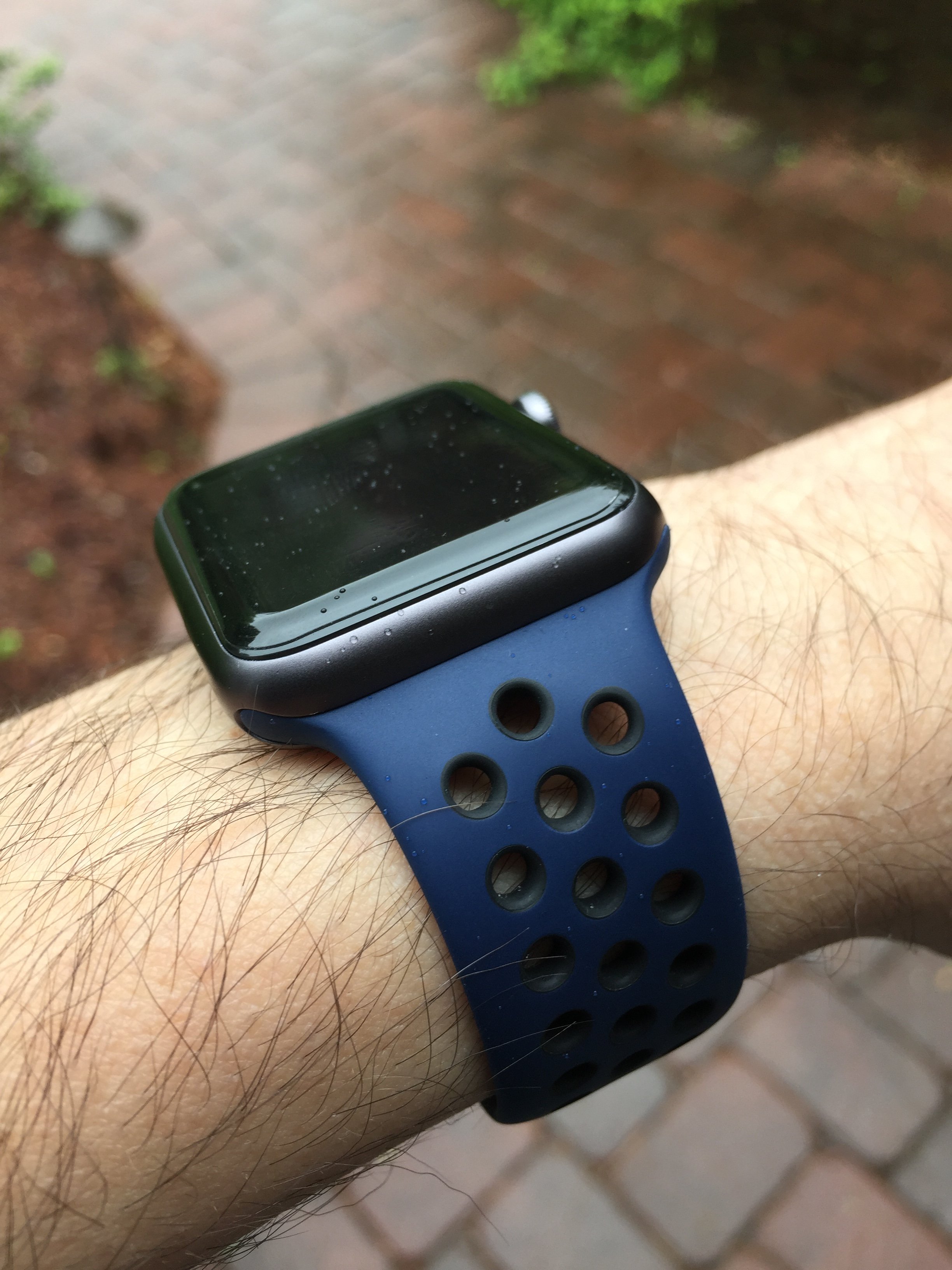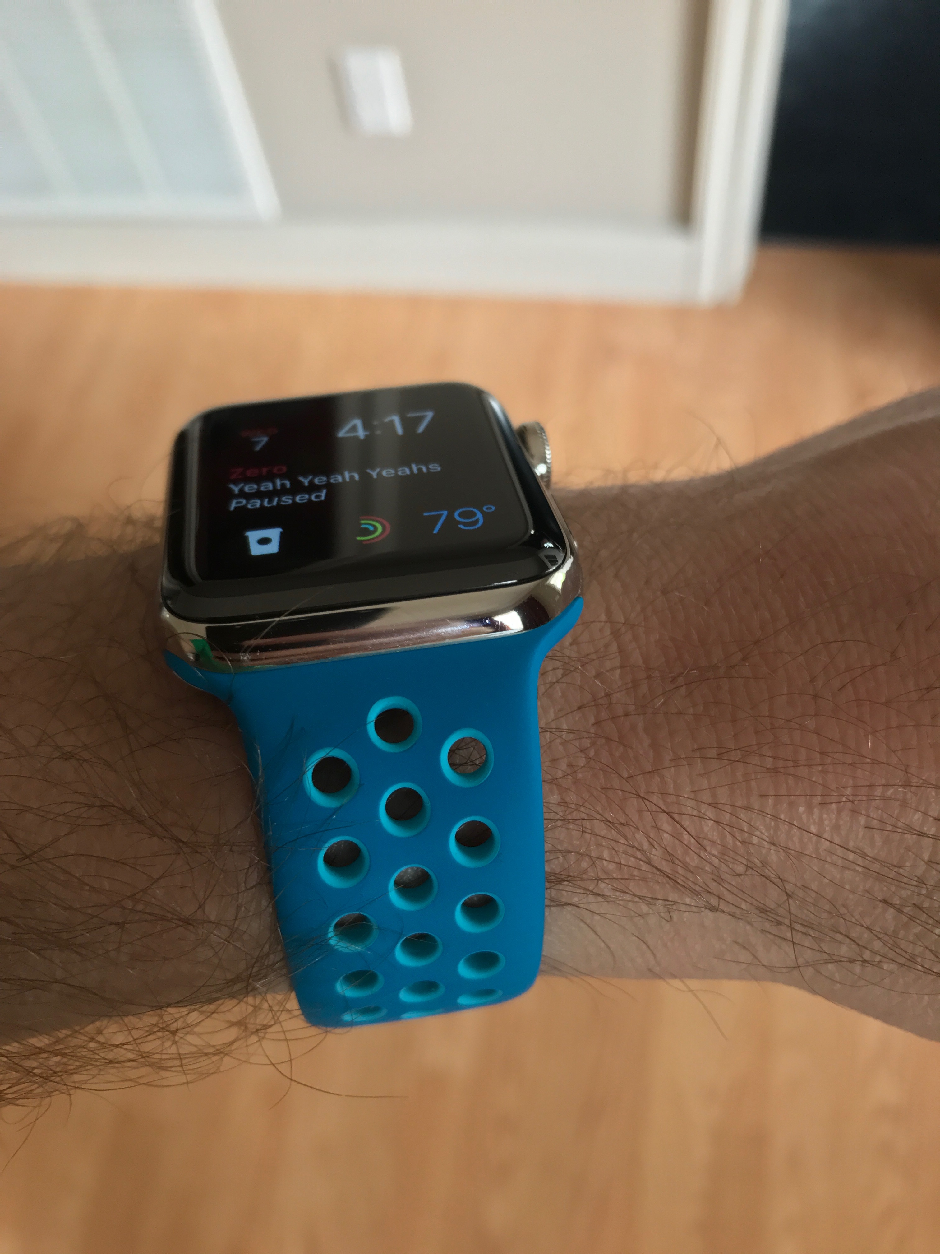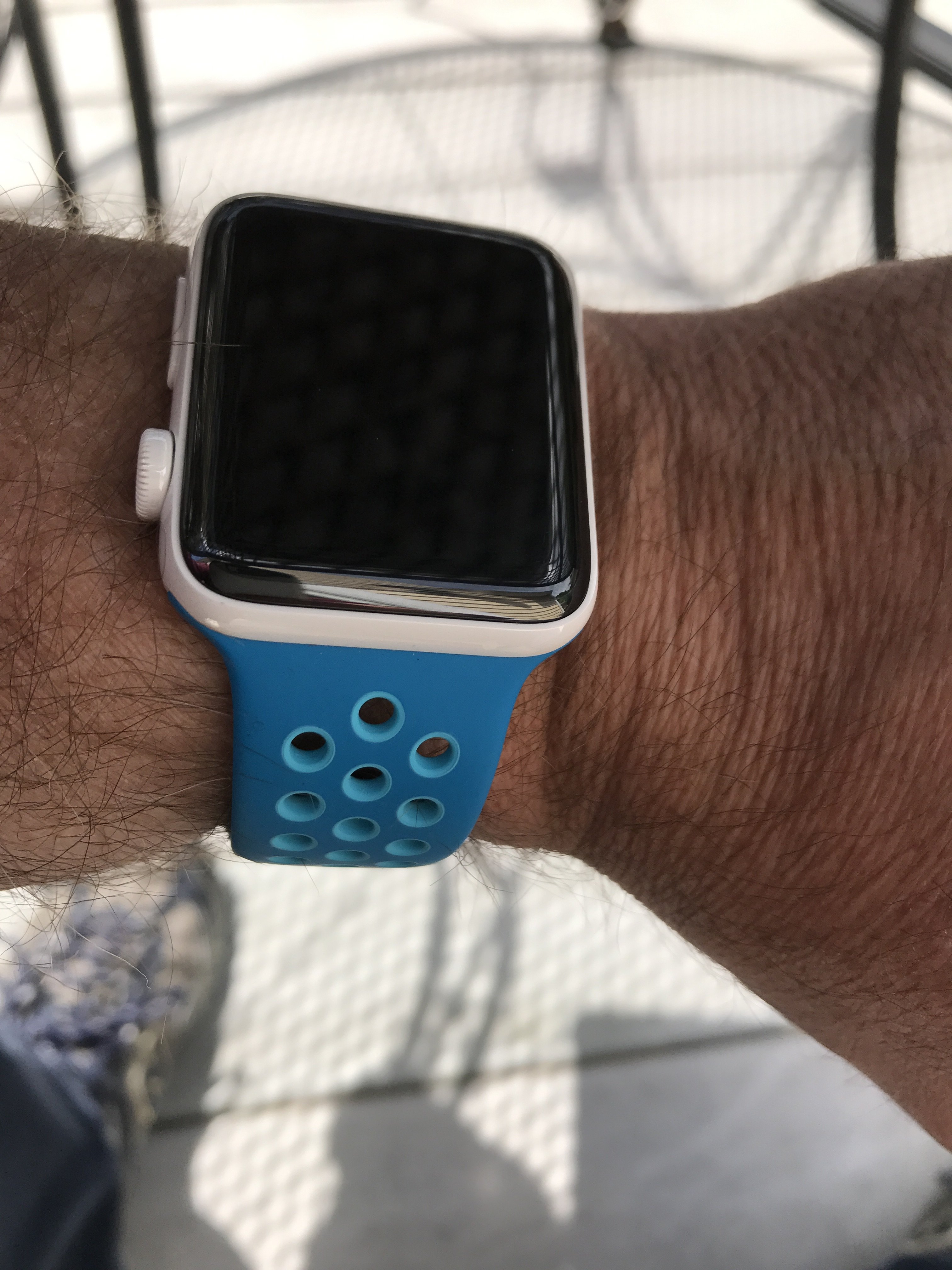 My contribution to the stream of pics - series 0 Space Gray Sport, outside, shortly before sunset, but quite cloudy. In real life, the blue feels just a touch darker and more saturated than this, but all in all, pretty close to how they actually look to me. From three feet away in daylight, the violet is subtle, the blue is more bold (and the rainbow is fabulous!).