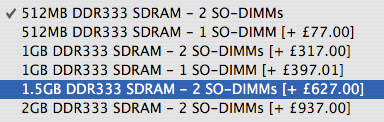 Apple want *£620 extra* (that's $1100 US) to supply it with the full 1.256Gb RAM. Is there any cheaper route to 1.256Gb or at least 1Gb ? Here in the UK I can't find any 3rd party retailers selling 1Gb PC2100 chips.