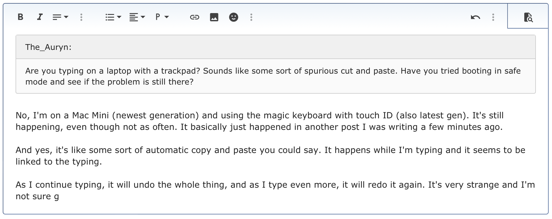 So I updated to the latest version of Ventura, this post for example. So out of nowhere, some of what I typed will get replaced with something else I've typed. Usually it's something like the beginning of a paragraph I've typed in the texture here will get replaced by the beginning of another paragraph I've typed.
