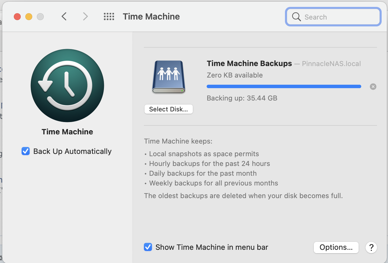 As you can see from the screenshot, it looks like it's finished. The progress bar is complete. There's no estimate of time or data remaining, but it's been like that for hours. The other odd thing is the Space Available shows Zero. There's a terabyte of space on the volume I created, and Time Machine report as much when it started.
