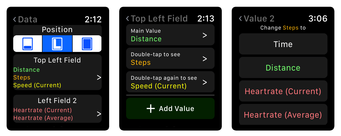 In the example below, the top left field in the 'L' shows distance, but will change to show steps when double-tapped. Double tap again to see the speed, and again to get back to the distance. It sounds complicated but it is actually pretty easy to configure exactly what you want.