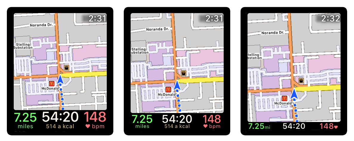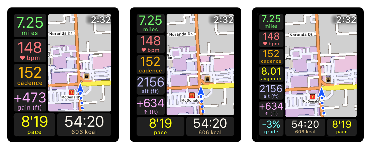 This gives 9 different possible modes, giving trade-offs between the size of the map, the size of the text, and the number of fields. In all modes you can quickly double-tap to switch to and from a full-screen map. Here are some sample screenshots of each: